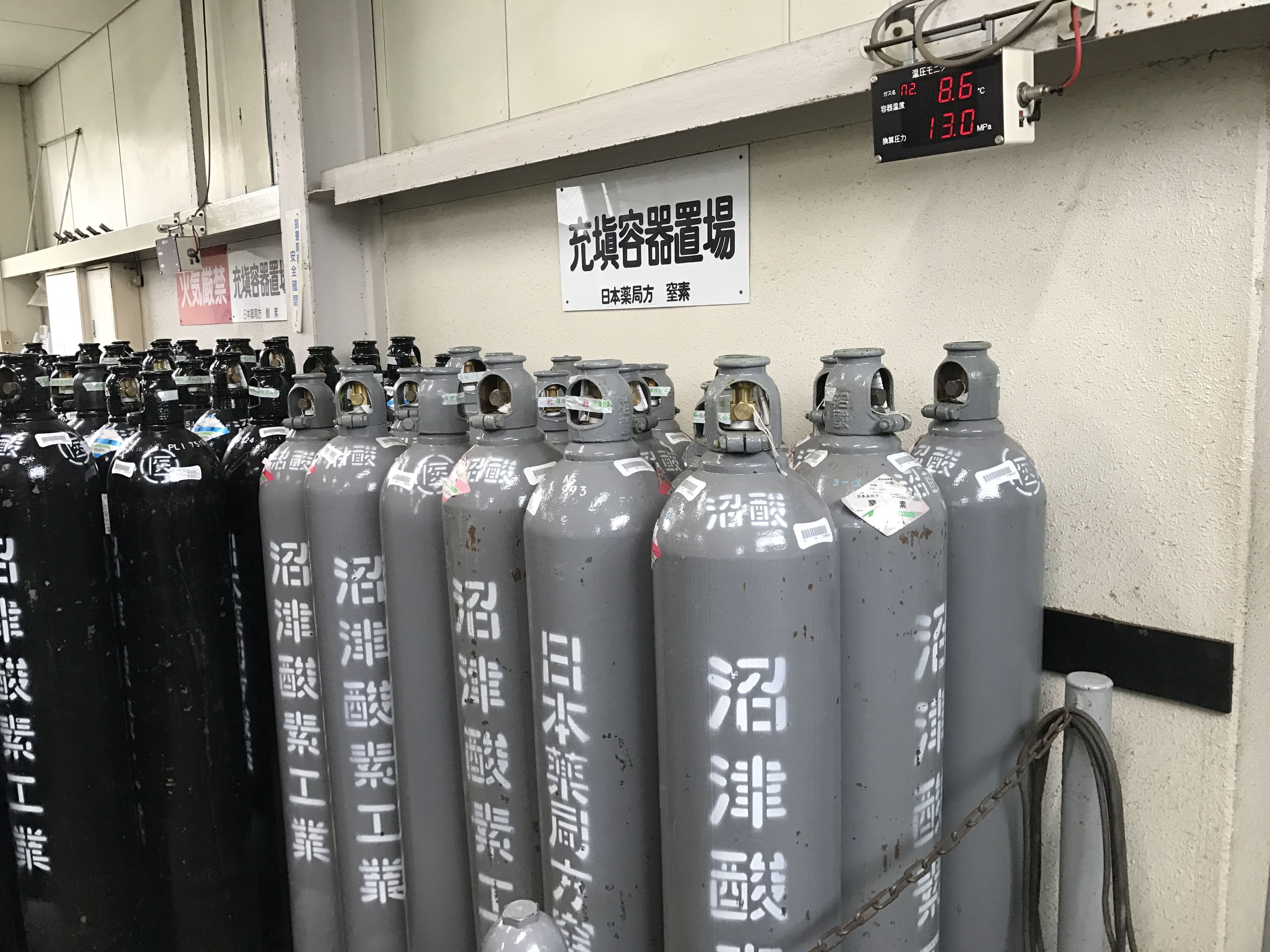 沼津酸素工業では、すべての容器に対してコンピューター制御による容器耐圧検査を実施しています。また、錆などによる容器の劣化を防止するための外部研磨や塗装については、作業の確実性を保持し、同時に作業者への負担を軽減するため、専用の設備を整えるなどの配慮を行っています。